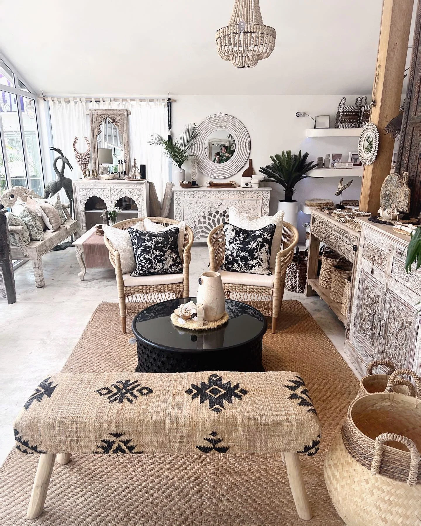 Natural materials like rattan, linen, and reclaimed wood that breathe with the climate.
