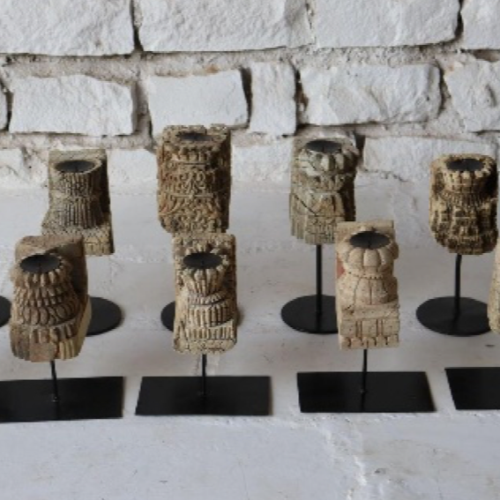 These carved wooden candle holders bring a warm, sculptural feel to any space, each one uniquely shaped and detailed by hand. Elevated on simple metal stands, they create a striking contrast between natural texture and clean, modern lines.