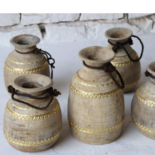 A beautiful blend of natural texture and refined detail, this handcrafted wooden pot is elevated with intricate brass embellishments that add a subtle touch of warmth and elegance. The softly weathered wood contrasts beautifully with the decorative brass banding, while the rope handle detail enhances its rustic, artisanal appeal.