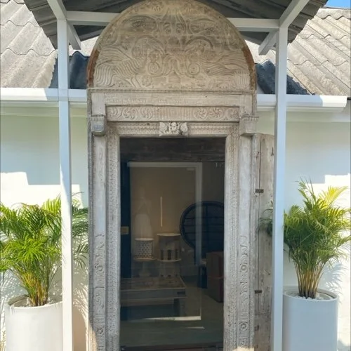 Designed to hang on exposed metal hardware, this door combines traditional craftsmanship with a contemporary sliding format. Ideal for use as a room divider, feature door, or dramatic wall element, it suits villas, boutique hotels, and curated island interiors. Natural variations, wear, and surface markings are part of the door’s character, reflecting its artisanal origins and individuality.